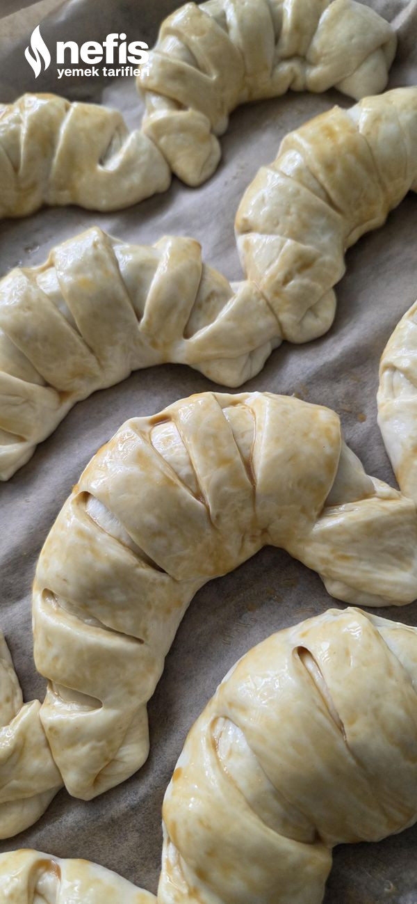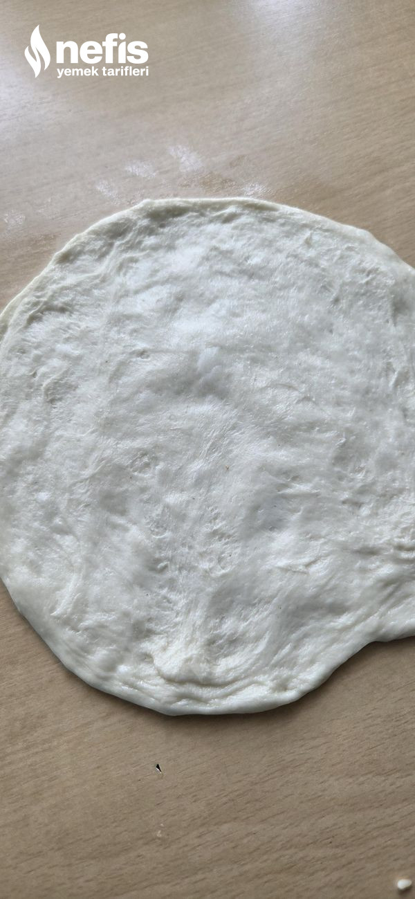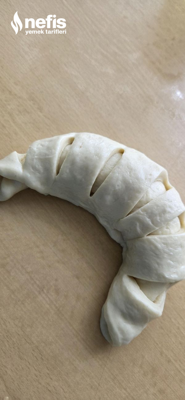- Mayalanan hamurumuzdan mandalina büyüklüğünde kesimler alarak yuvarlanıp elimizle tezgahta bastırarak güzelce acıyoruz uç kısmına hazırladığımız kıymalı harçtan koyarak belli bi kısma kadar kapatıp pizza bıçağı ile makul yerlerine çizik atıyoruz ve kapatıyoruz .