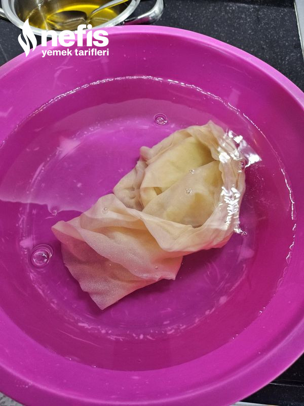 6. Kaynayan suyun içine tuz ekleyin ve bir yufkayı alın içine atın 1 dk tutun çıkartın, yanında öteki bir büyük kabın içine soğuk su bulundurun içine atın elinizle fazla suyu alın.