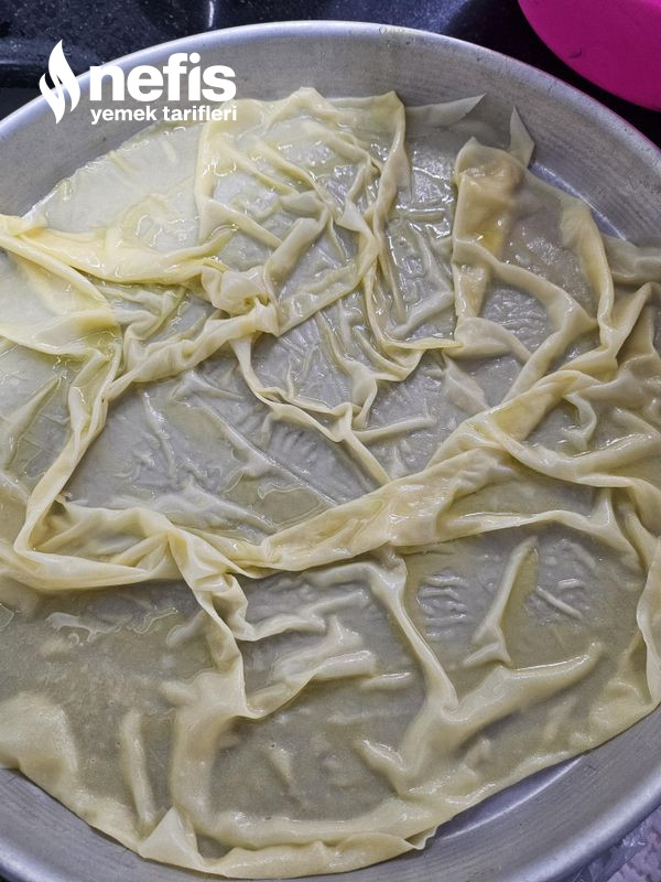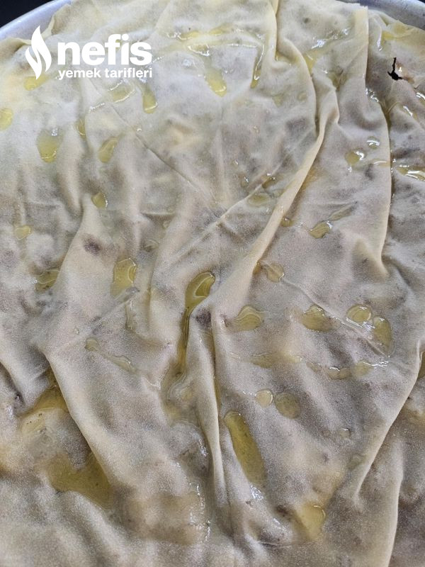 7. Altını yağladığınız tepsinin içine güzelce yerleştirin, üzerine 2 yemek kaşığı erittiğiniz yağdan gezdirin .