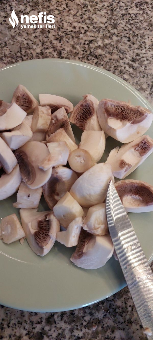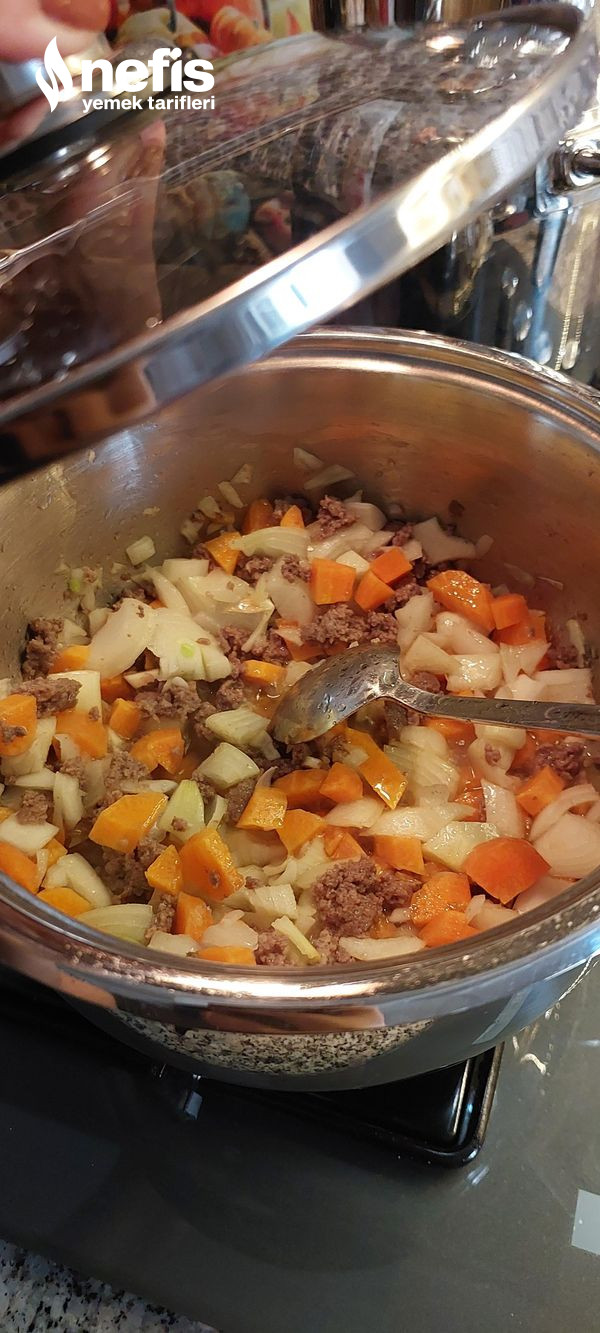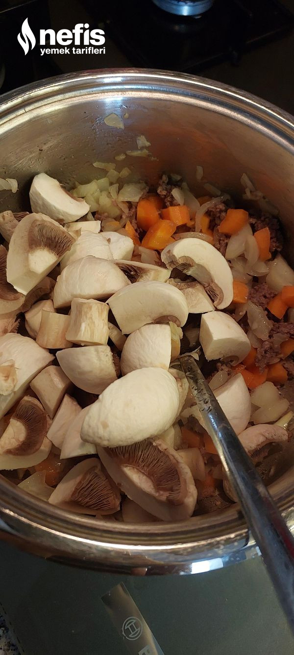 1. İlk kıymayı kavuruyoruz. Sonra soğan ,sarımsak ve havuç ekleyip kavuruyoruz yıkayıp iri doğradığımız mantarları da ek edip mantarlar kavrulunca salça, tuz ve baharatları ek edip karıştırıyoruz 2 -3 dakika.