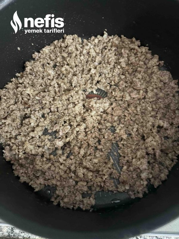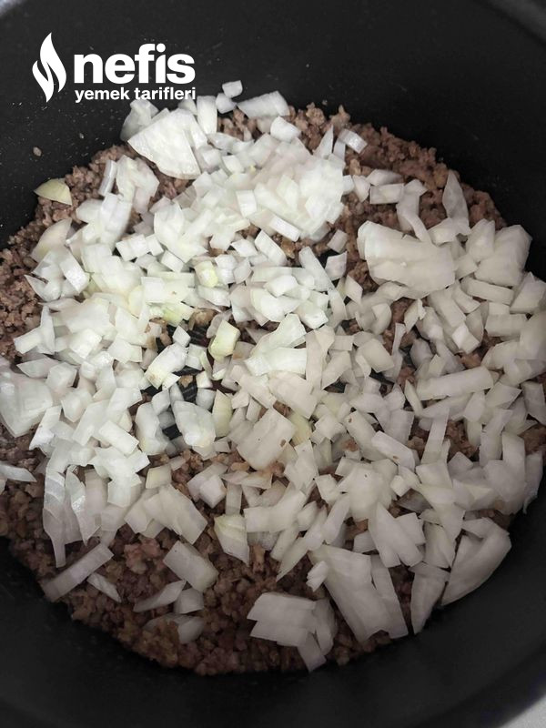 3. Kavrulan kıymanın üzerine ince ince doğradığımız soğanları ekleyelim. Zeytinyağını ek edelim.