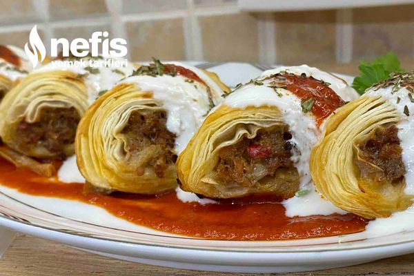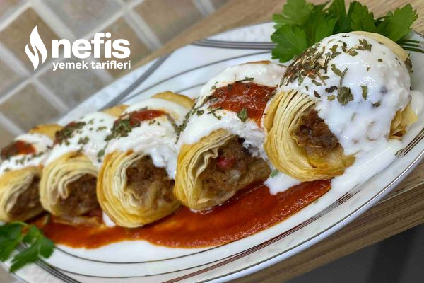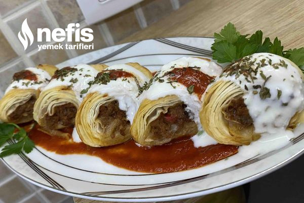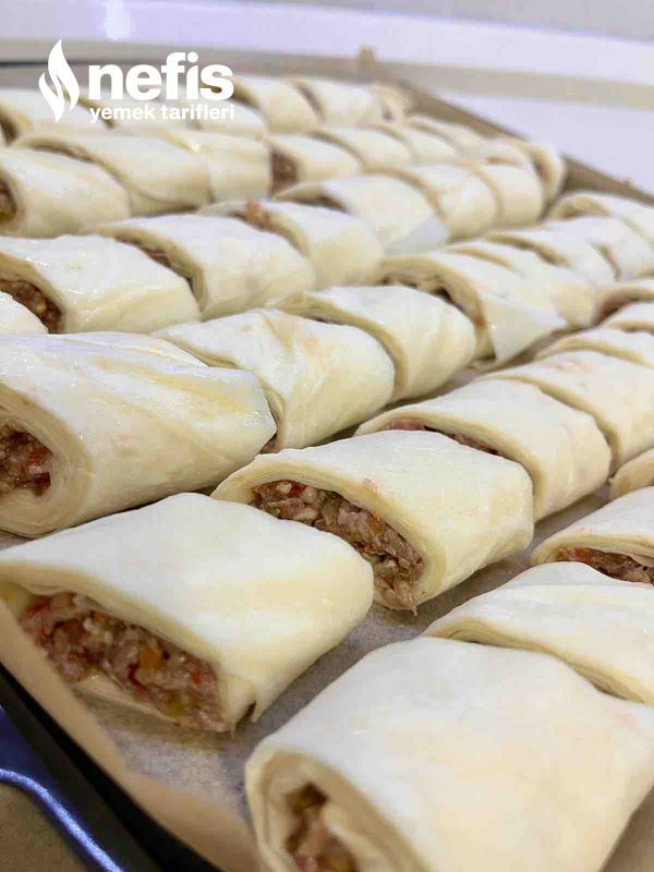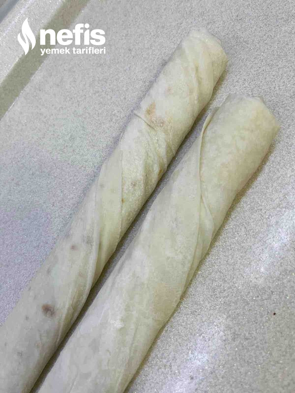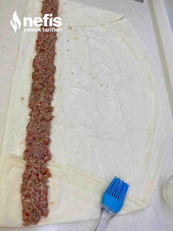 - Yufkamızı fotoğrafta görüldüğü üzere serip içine zeytinyağı sürüp( sürülmese de olur ) kıymalı harcı yerleştirip sarıyoruz.