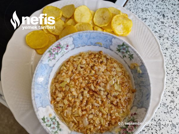 2. Tavada yalnızca 3-4 yemek kaşığı patatesin kızardığı yağdan bırakılarak soğanlar tuzla birlikte kavrulur ve hazır edilir.