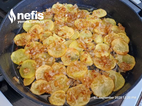 3. Hazır olan patatesler tekrar boş tavaya dizilir ve üzerine kavrulmuş soğan yayılır.