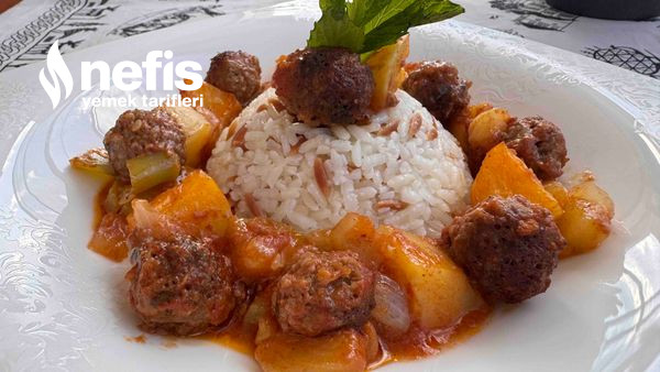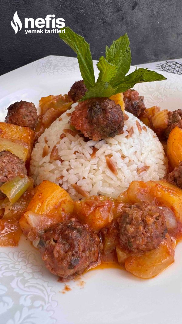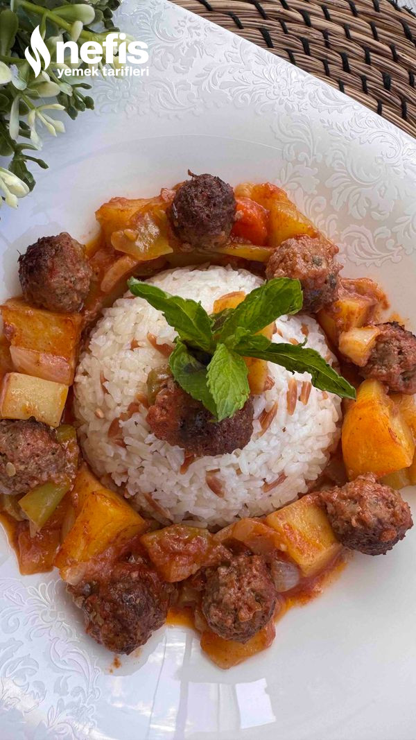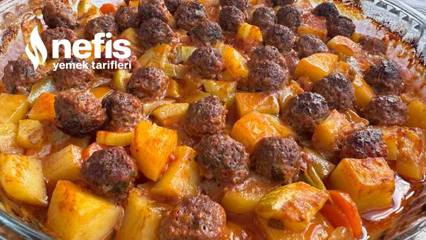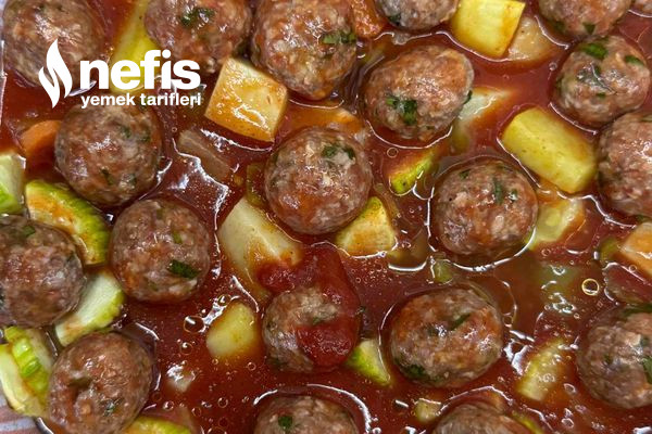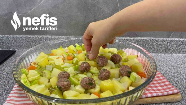 - Pişen sebzelerin üzerine köfteleri rastgele yerleştirelim. Sos için materyalleri karıştırıp borcam üzerine dökelim.
