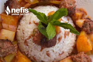 - Pişen sebzelerin üzerine köfteleri rastgele yerleştirelim. Sos için materyalleri karıştırıp borcam üzerine dökelim.