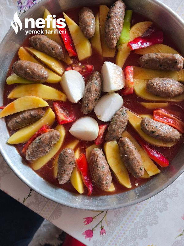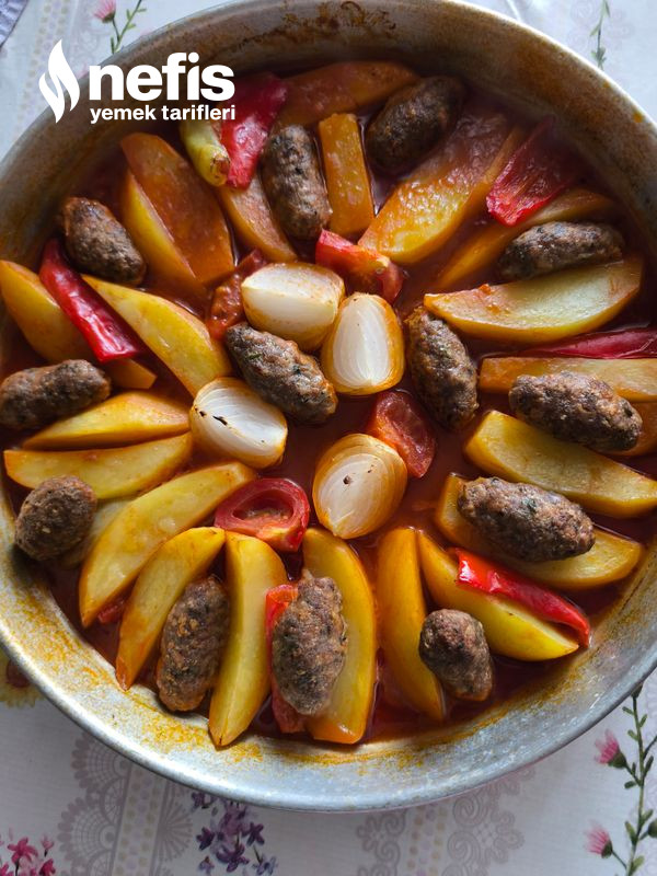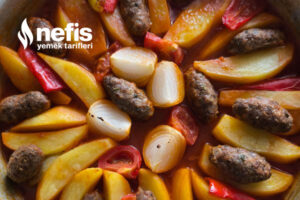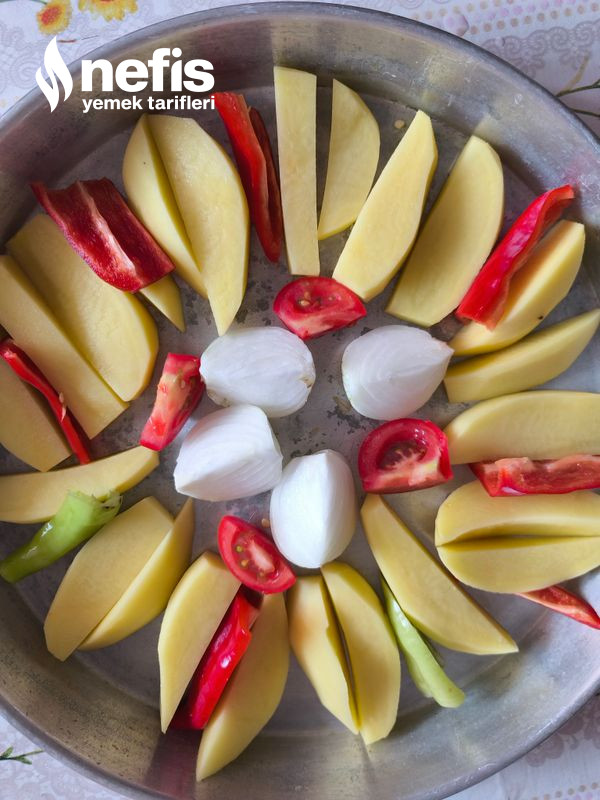 - Tepsiye patatesleri ,soğanları ,biberleri köfteleri domatesleri dizelim.
