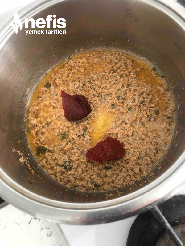 4. Kavrulan kıymaya domates ve biber salçamızı ekleyip karıştıralım.
