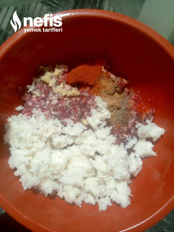 1. Bir kaba kıyma, ekmek içi, sarımsak, tuz, kırmızı toz biber ve kimyon alınarak uygunca yoğrulur.