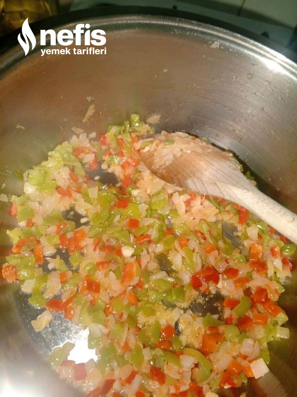 6. Üzerine soğan, yeşil biber, kırmızı biber ve sarımsak eklenerek düzgünce kavrulur.