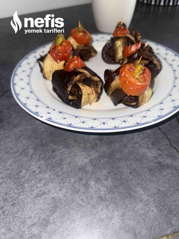 - İki dilim patlıcana bir köfte gelecek halde saralım üzerine kürdan batıralım domates biberi de üzerine koyalım bir kasede 1 kaşık salça ve 2 bardak sıcak su yapın.