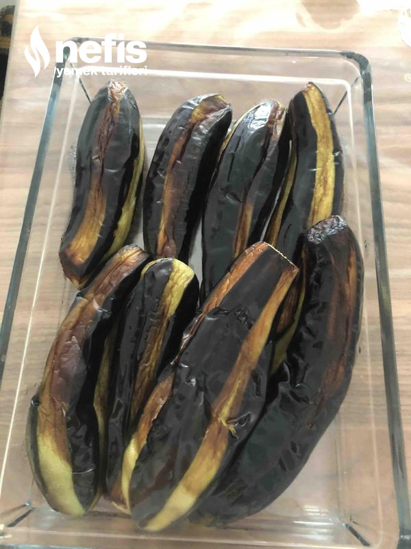 6. Patlıcanlar soğuduktan sonra 3 parmak kalınlığında kesin. (dilerseniz patlıcanları 3 parmak kalınlığında kesip sonra kızartın tercih sizin).