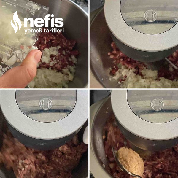 4. İç arzı için yorma kabına kıymayı rendeleyip suyunu sıktım soğan sarımsak galeta unu ve baharatlarını suyunu katarak yoğurdum.
