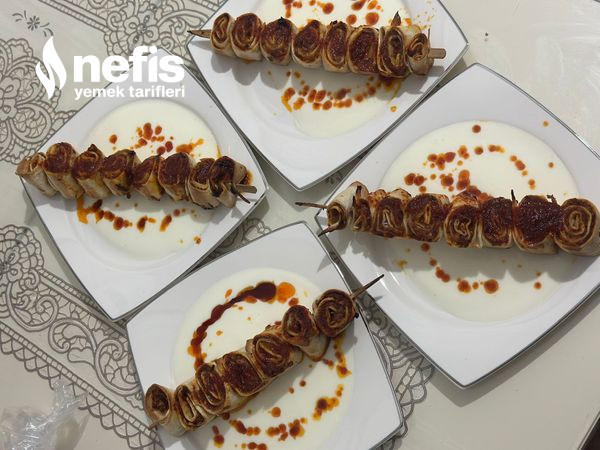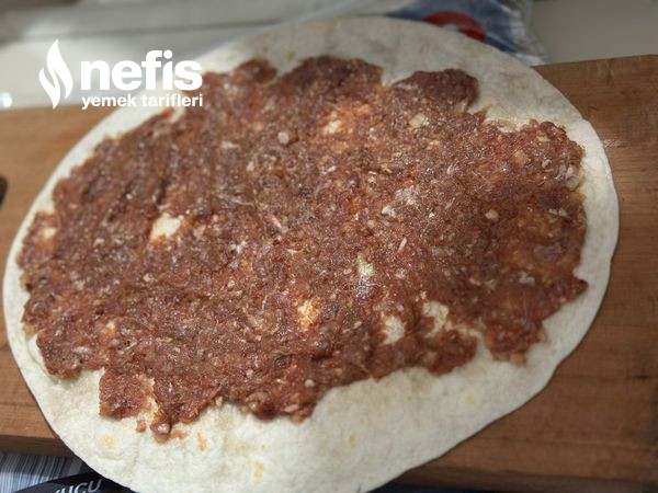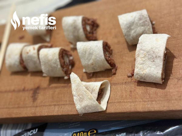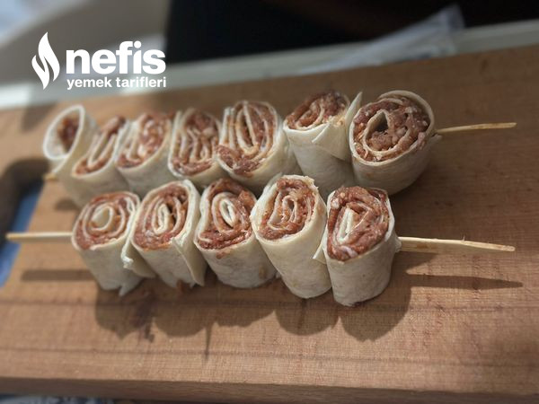 2. Lavaşı alıyoruz kıyma harcından lavaşa yayıyoruz ,rulo yapıp kesip şişe diziyoruz.