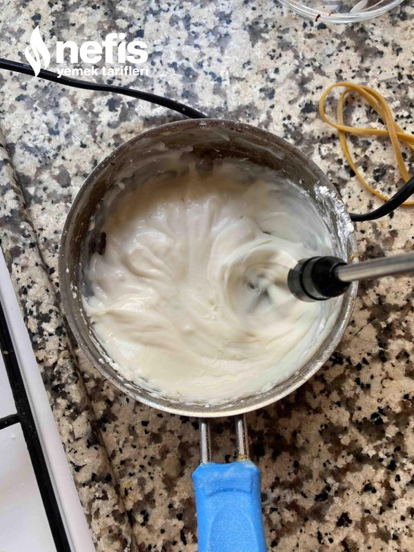 - Ilıyınca içine 2 yemek kaşığı labne ve 1 paket vanilin ekleyin, mikserle çırparak pürüzsüz hale getirin.