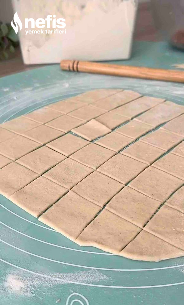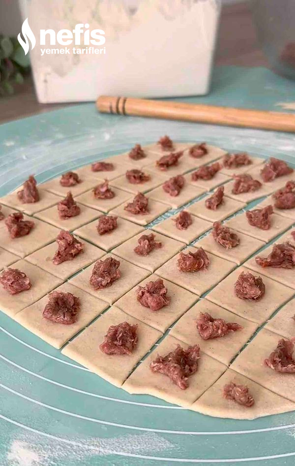 6. Kıymadan kopardığınız küçük modülleri kare kare kesmiş olduğunuz hamurun üzerine koyun.