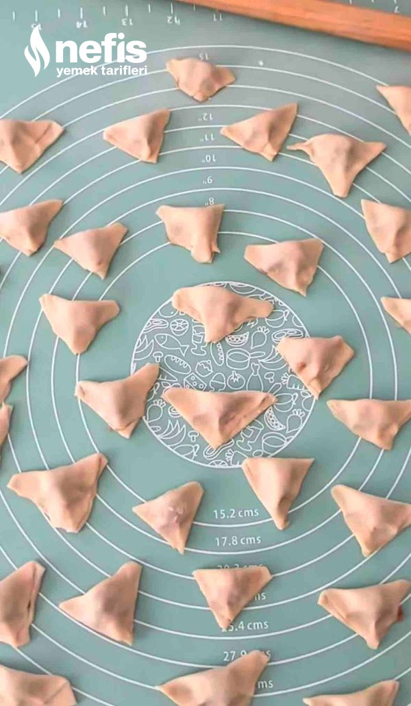 7. Kare olan ve kıyma koyduğunuz hamurun bir köşesini öbür köşesine getirip üçgen biçimi yapın.
