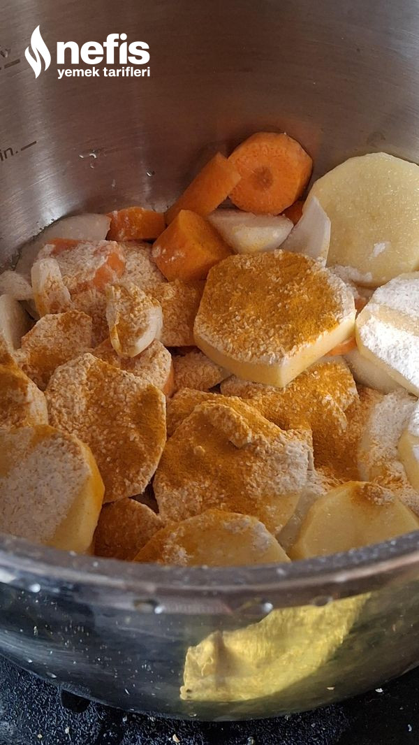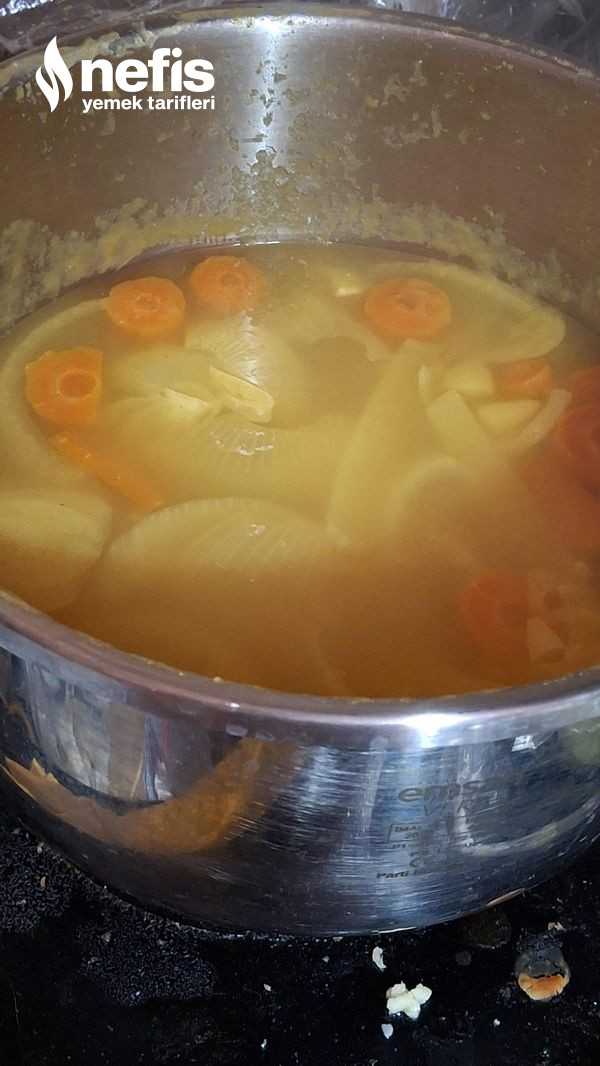 - Soğan, sarımsak, havuç ve patatesi soyup ayıkladıktan sonra iri iri doğruyoruz. Akabinde derin bir tencereye alıyoruz.