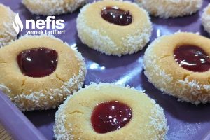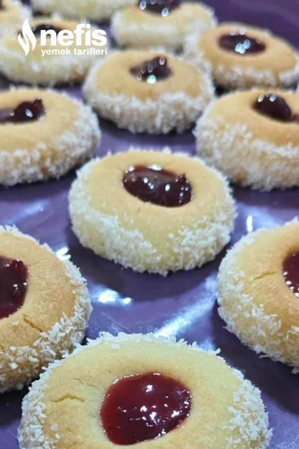 - Pişip soğuyan kurabiyelerin kenarlarına bıçak yardımı ile bal sürüp hindistan cevizine bulayın. Çukur olan yerlere vişne reçelini dökün. Deneyecek olanlara afiyet şifa olsun inşallah 🎀.