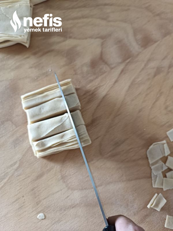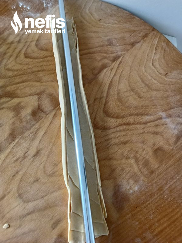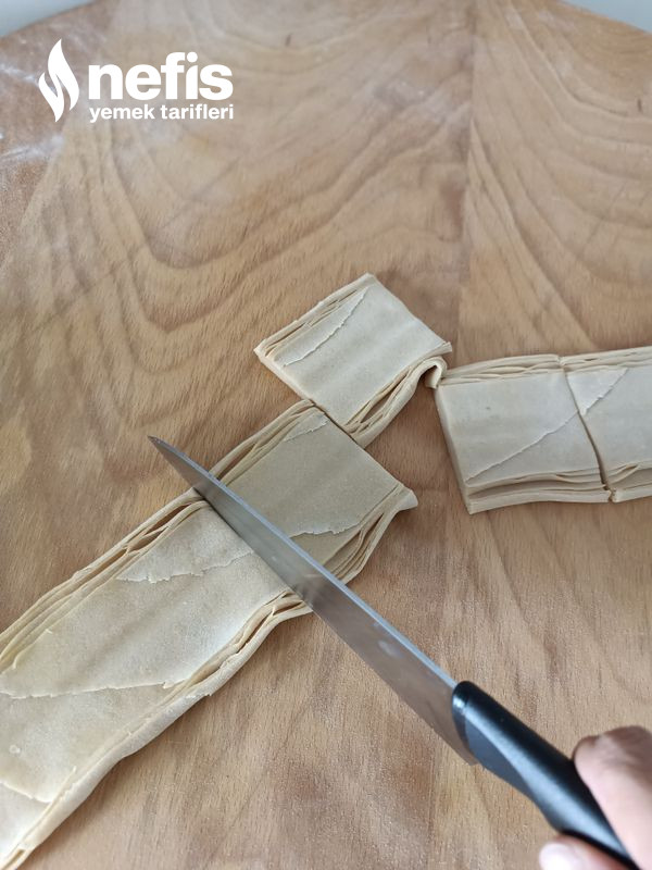- Hamuru oklavaya sarıp bıçakla tam ortasından uzunlamasına keselim.