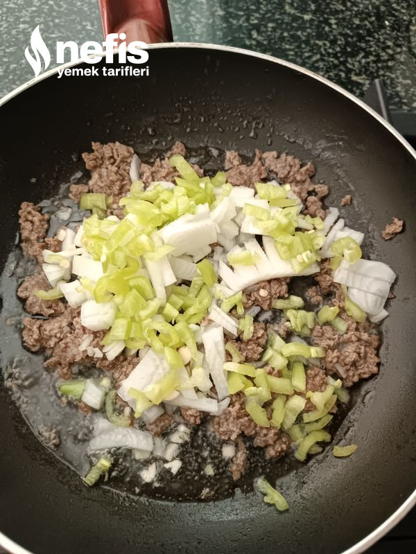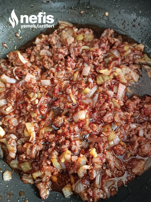 - Pişen hamurların üzerine hazırladığımız kıymalı harcı ekleyip karıştıralım.