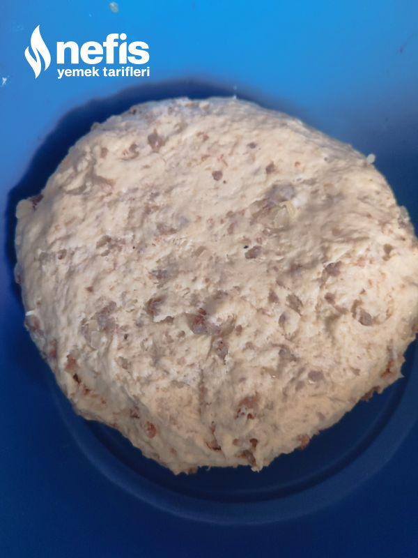 7. Kıymalı harç soğuyunca hamuru dolaptan alıp kıymalı harcı bu hamurun içine katalım ve güzelce yoğuralım (bunun görselini de ekliyorum).