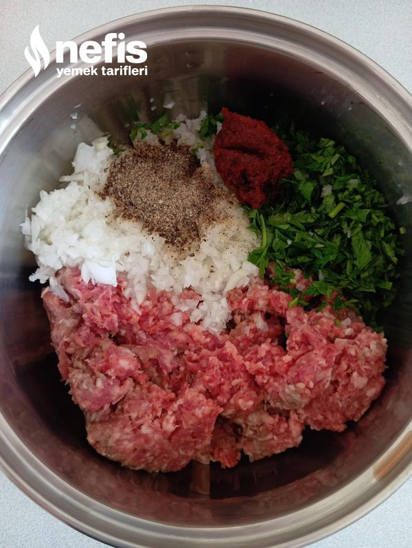 3. Uygun bir yoğurma kabındaki kıymanın üzerine soğan, maydanoz ,karabiber, salça ve tuzu ekleyerek karıştırıyoruz. Hazır olan iç harcı bir kenara alıyoruz.