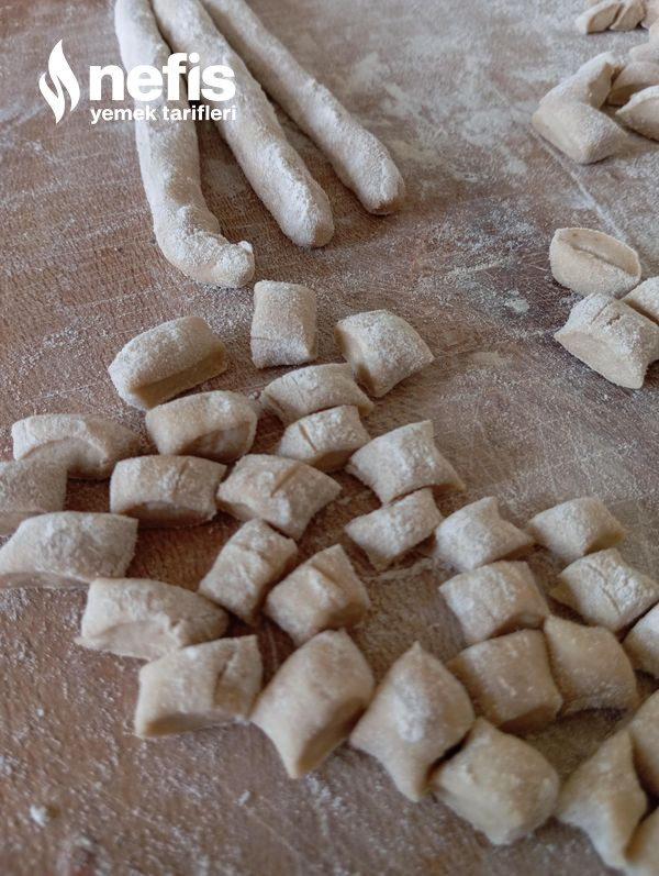 7. Üzeri için de hamur kırtlakları için de 1 beze hamuru alıp kesiyoruz ve uzun yuvarlak şeritler yapıyoruz ve una batırıp küçük küçük kesiyoruz.