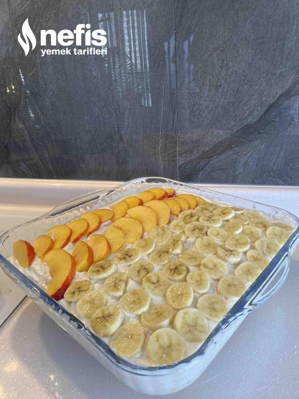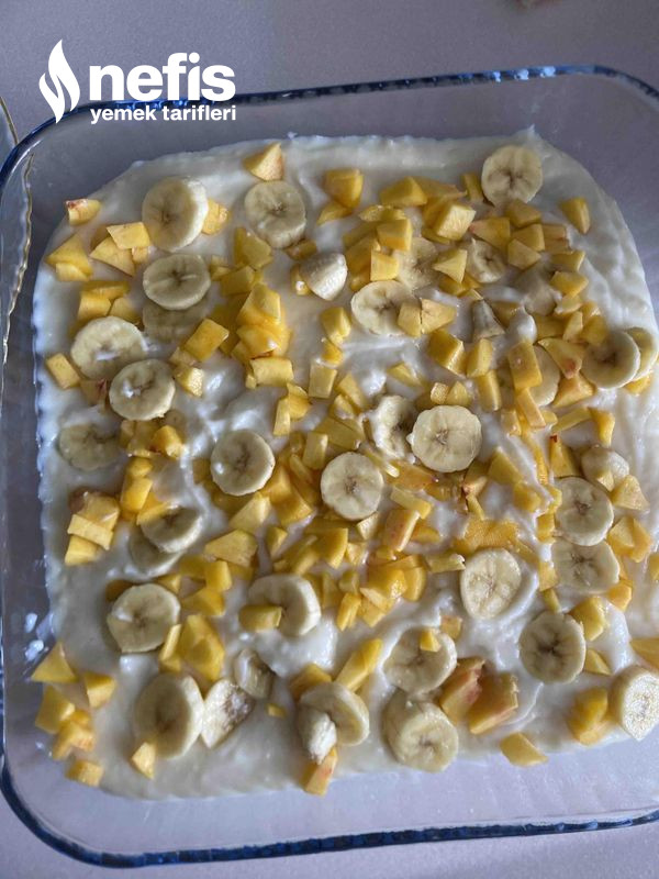 - Üzerine muhallebi ve meyveleri ekleyelim,böyle bir kat çıkalım en üzerine kalan harcımızdan ekleyip bitirelim.