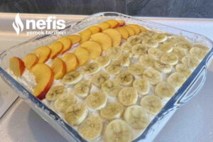 - Ardından meyvelerimizi doğruyoruz ben muz ve nektari kullandım, muhallebimiz soğuduktan sonra içerisine krem şanti ekleyip karıştıralım.