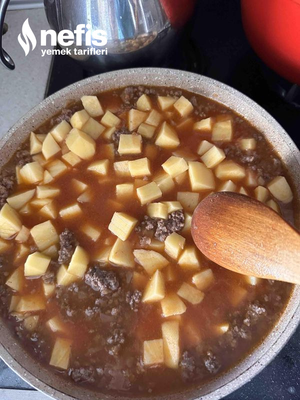 - Sonra salçayı kavurup biraz daha kavurun ve küp küp doğradığınız patatesleri de ekleyin ve karıştırın.