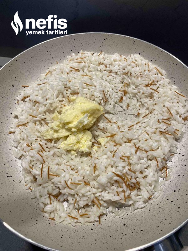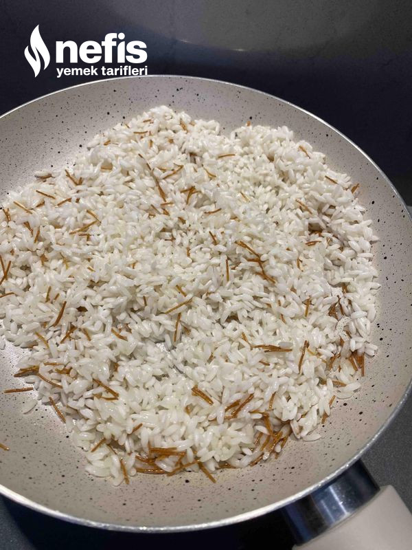 - Biraz kavurduktan sonra rengi değişen telşehriyenin üzerine pirinçleri döküp birkaç dakika karıştırın.