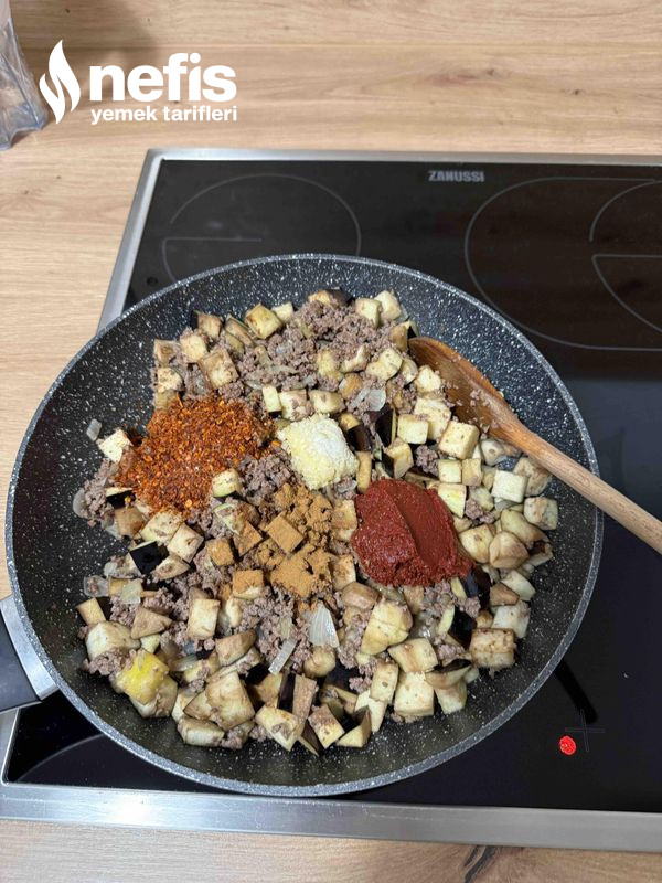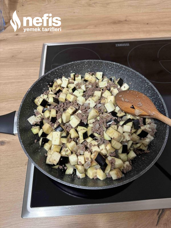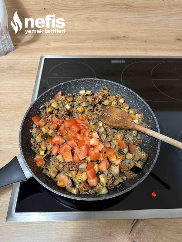 - Soğanlar pembeleşince küçük küplere kestiğimiz patlıcanları ve domatesi ekleyelim ve kavuralım.