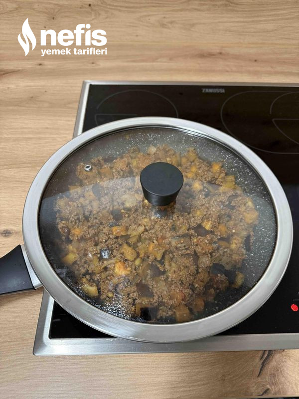 - Sıcak suyu ekleyip orta ateşe kısalım ve 10dk kapağını kapatıp pişirelim. Böylelikle patlıcanlar uygunca yumuşayacak.