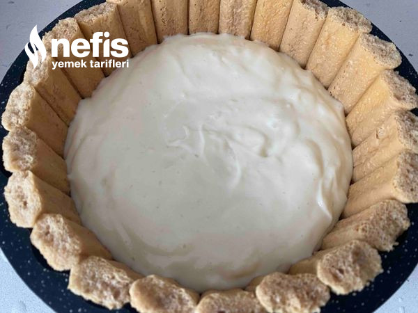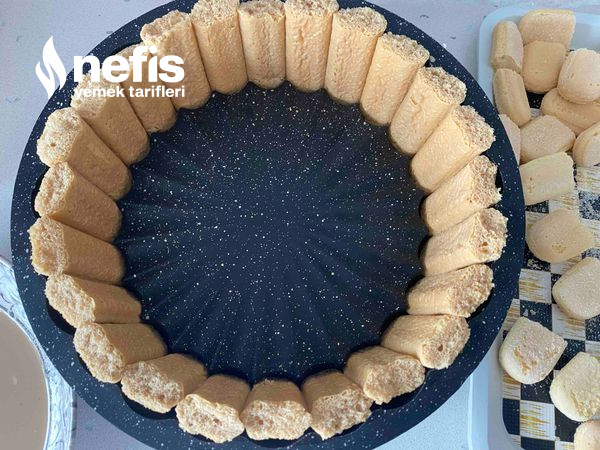 10. Kalıbın kenar kısmına bisküvilerimizi yerleştirdikten sonra muhallebimizin yarısını kalıba boşaltıp üzerini düzeltelim.