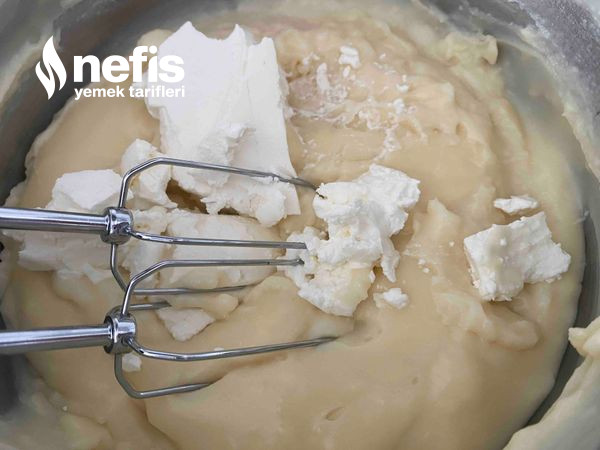 6. Ilınmış olan muhallebimizin içine 300 gram labne peynirini ek edip mikser ile 5 dakika kadar çırpalım.