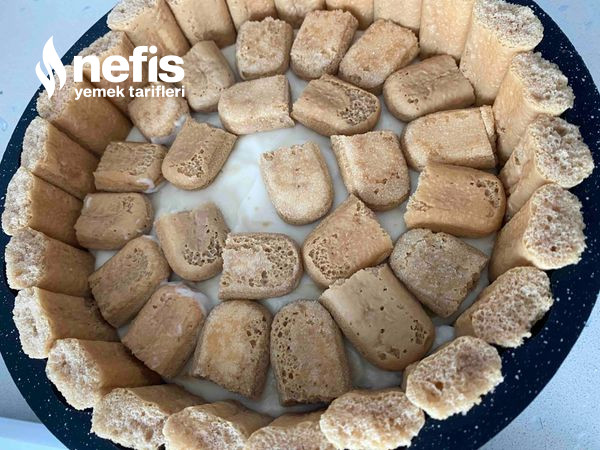 11. Muhallebinin üzerine, kestiğimiz kedi lisanı bisküvilerimizden kalan kesimleri süte batırarak boşluk kalmayacak formda yerleştirelim.