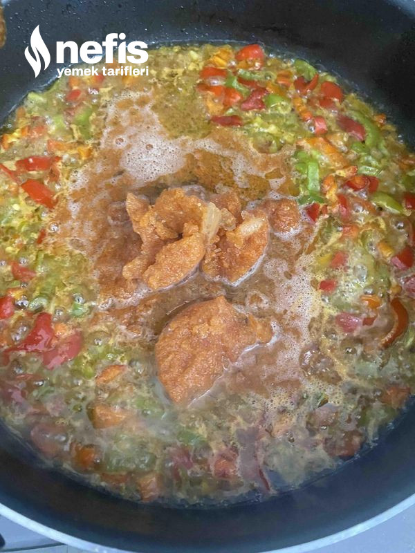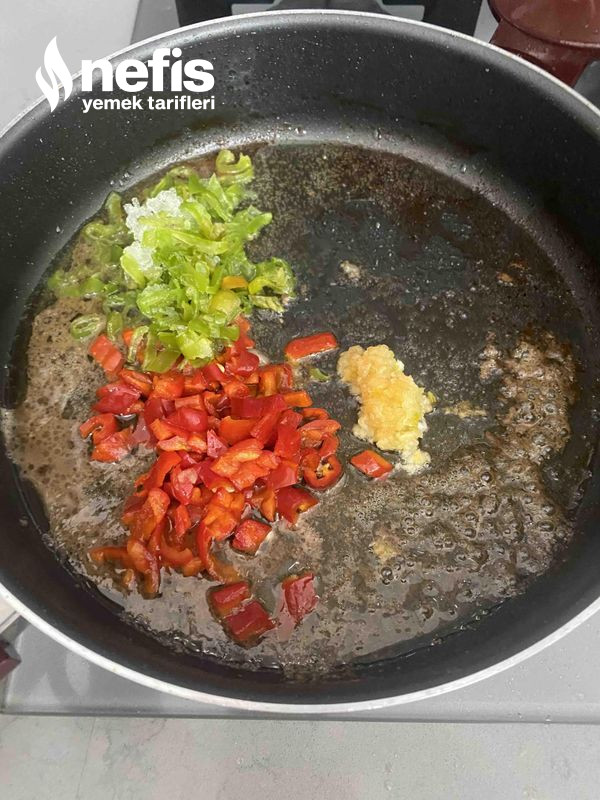 - Tavanın içine ince kıydığımız yeşil biber, kapya biber ve sarımsağı atıp ek ediyoruz.