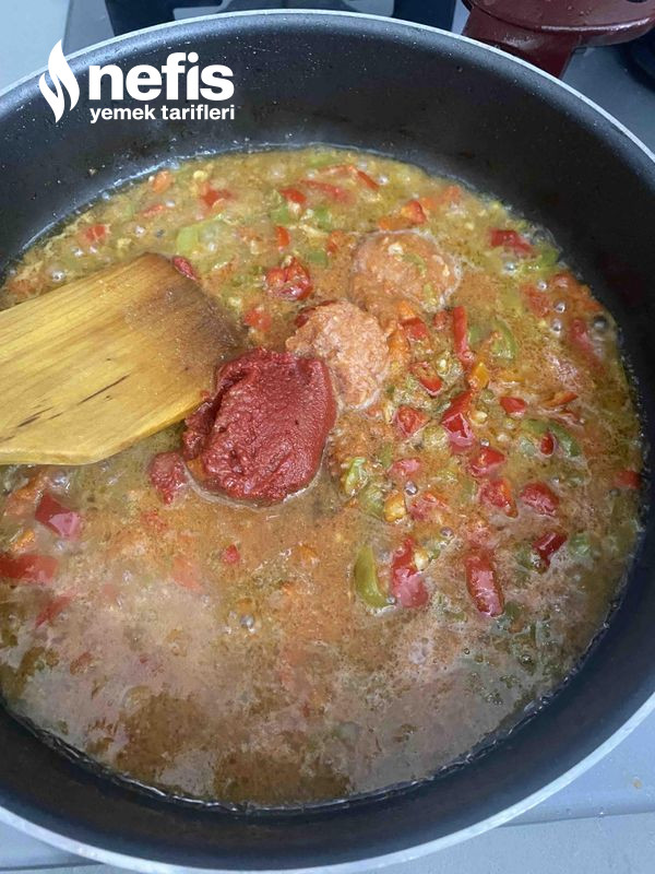 - Biraz kavurduktan sonra salça ve kabuğu soyulup ince doğranmış domatesti ek ediyoruz.