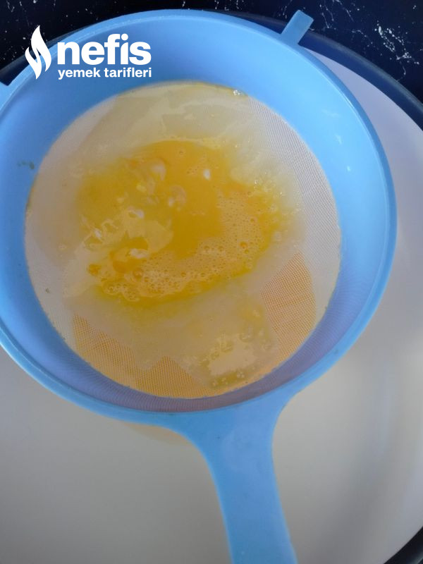 - Süzgeç yardımıyla yumurtayı süzüyoruz. Bu kısım yumurtanın daha akıcı ve istemediğimiz yumurta sarılarının topak kısmını uzaklaştırmak için değerli.