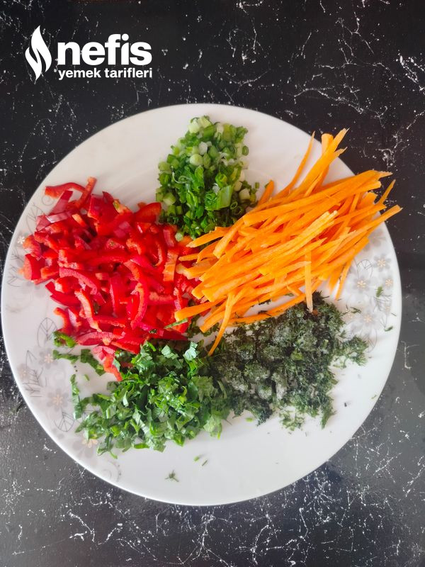 - Tüm sebzelerimizi ince ince doğrayıp yumurtayla karıştırıyoruz, tuz ve karabiber koyuyoruz.