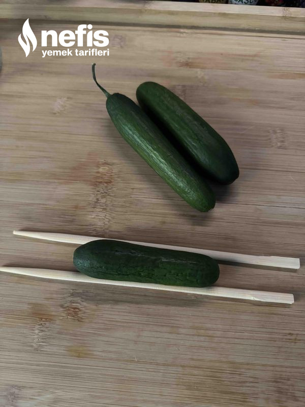 1. Chopsticklerin ortasına salatalığı koyalım.