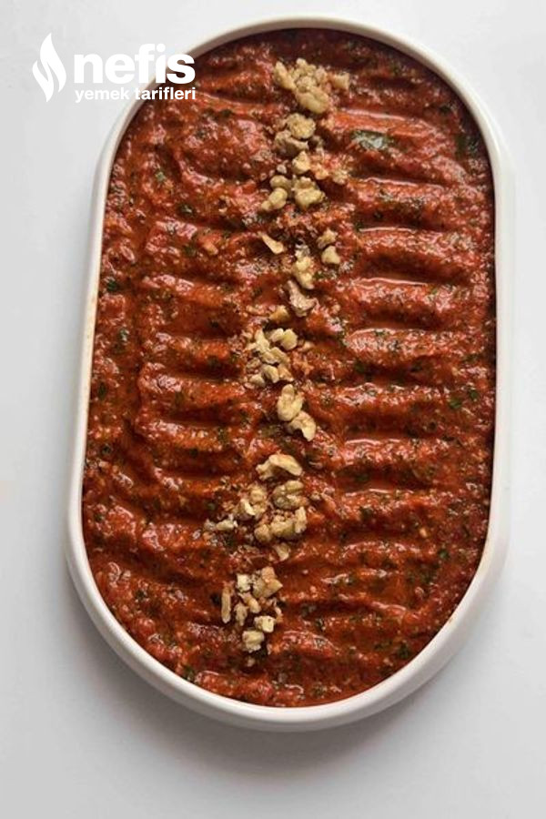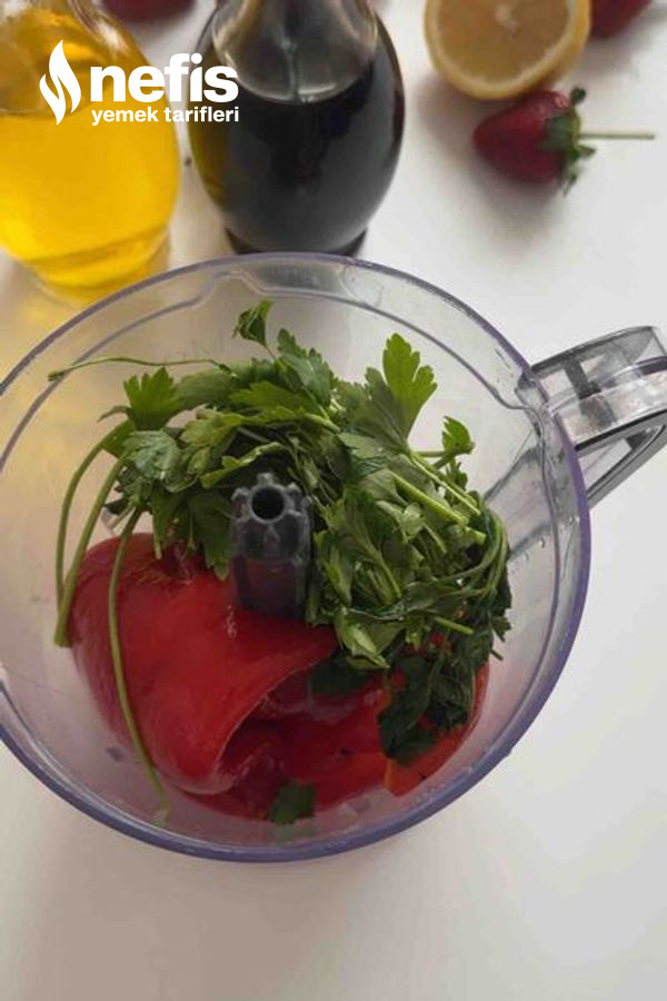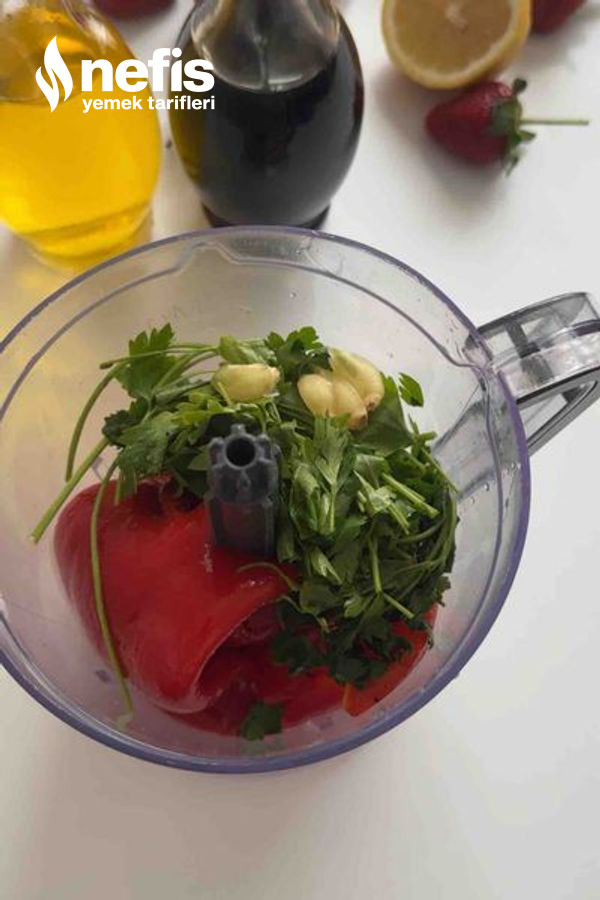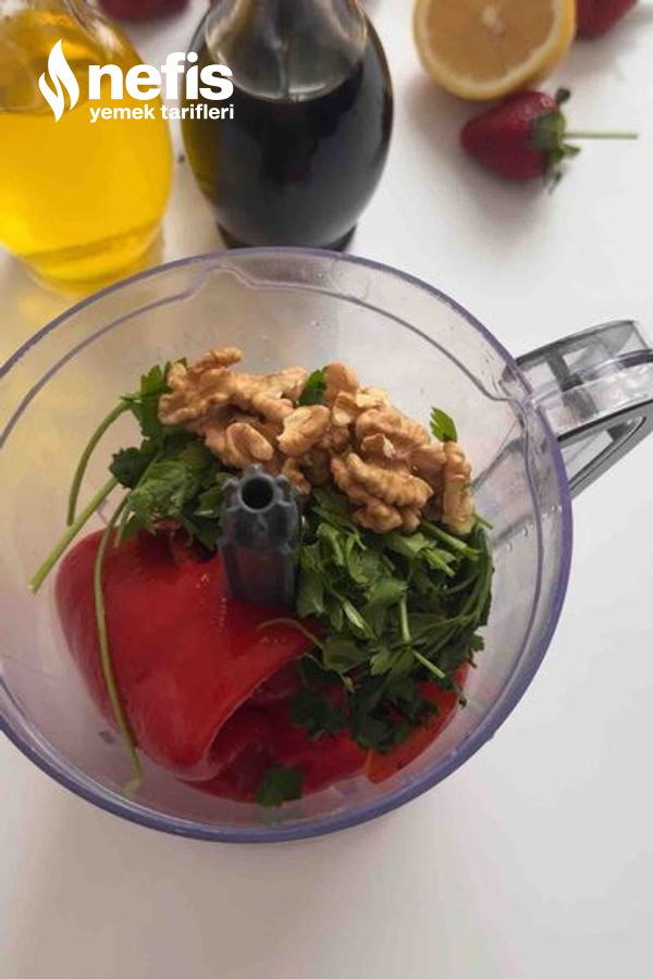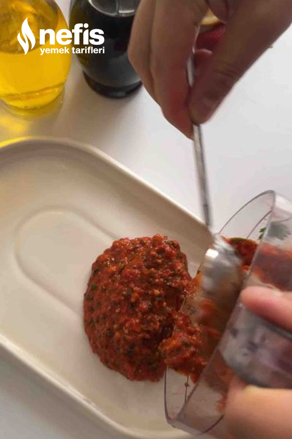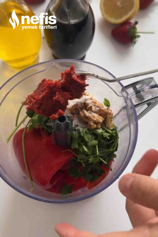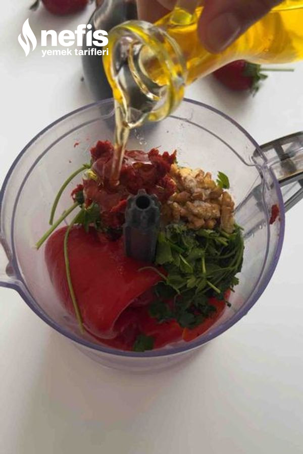 - Közlenmiş kapya biberleri ,maydanozu, cevizleri ,sarımsakları, tuz ,zeytinyağı ve salçayı rondoya koyup yeterlice püre haline gelene kadar doğruyoruz.