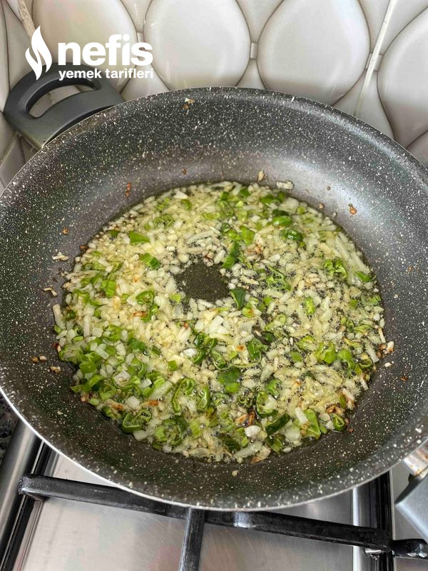 - Tavaya sıvı yağımızı koyalım küp küp doğradığımız soğan ve yeşil biberi ekleyip kavuralım.