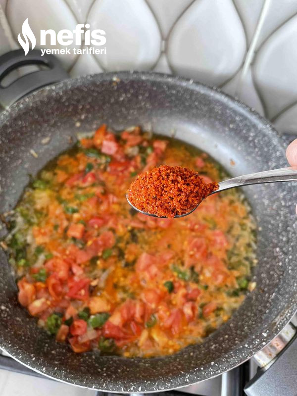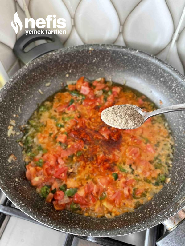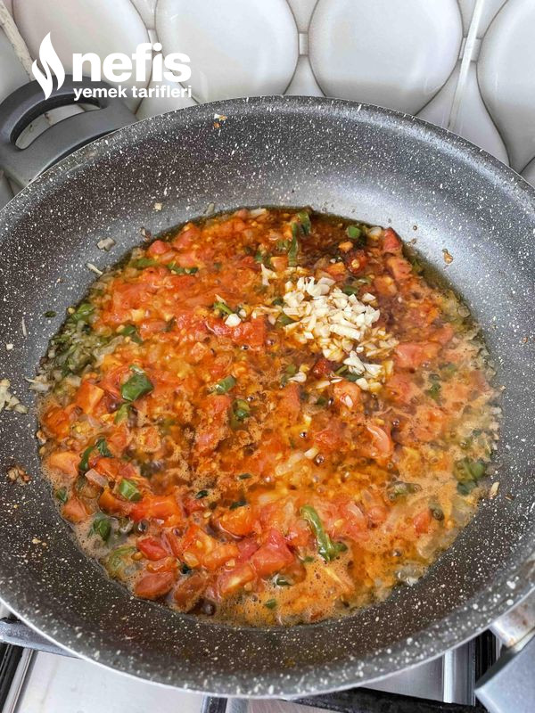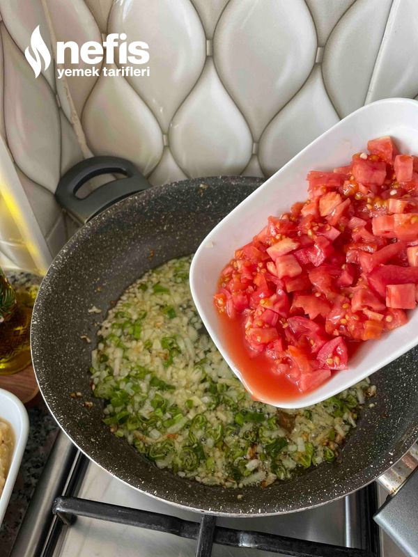 - Kavrulan soğanın üzerine domatesi ve ince kıydığımız sarımsakları ekleyelim tuz, pul biber ve karabiberi ekleyelim tavanın kapağını kapatıp kısık ateşte orta ara karıştırarak pişirelim.