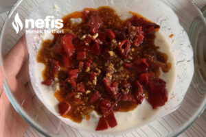 - Közlenmiş biberleride yoğurdun üzerine ekliyoruz.