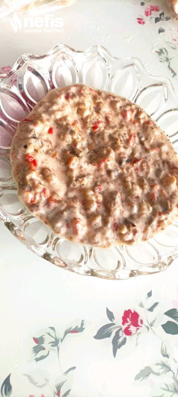 2. Karıştırma kabına yoğurt, mayonez, sarımsak ve közlenmiş sebzelerimizi koyuyoruz. Tuzumuzu da ekleyip, karıştırıyoruz.