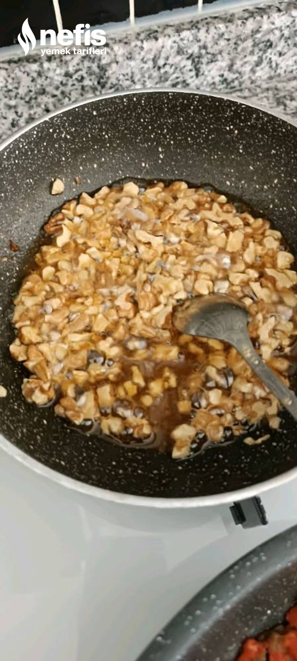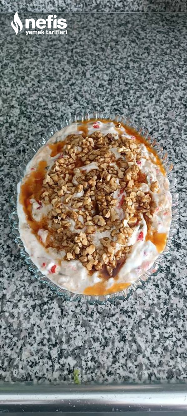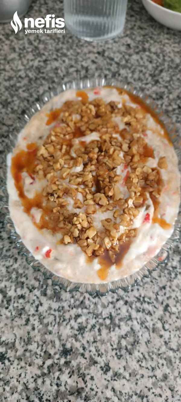 - Yoğurt ve sarımsağı başka bir kapta karıştırıp hepsini ekleyelim küçük bir tavada 3 yemek kaşığı sıvı yağ ile 2 yemek kaşığı doğranmış cevizi ve yarım çay kaşığı toz kırmızı biberi çevirip, yoğurtlu mezenin üzerine gezdirelim.