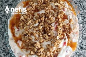 - Yoğurt ve sarımsağı başka bir kapta karıştırıp hepsini ekleyelim küçük bir tavada 3 yemek kaşığı sıvı yağ ile 2 yemek kaşığı doğranmış cevizi ve yarım çay kaşığı toz kırmızı biberi çevirip, yoğurtlu mezenin üzerine gezdirelim.