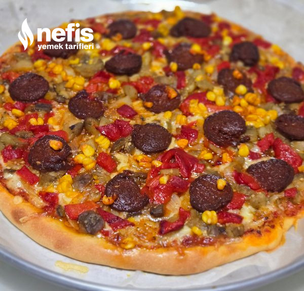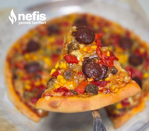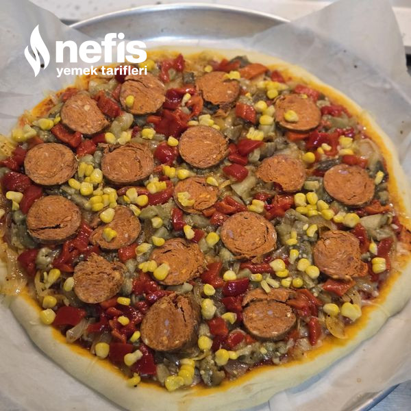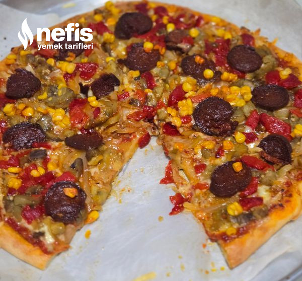 6. Önceden ısıtılmış 200 derece fırında 15 dakika kadar pişirin hamuru fırından çıkarıp üzerine sırayla rendelenmiş kaşar peynirini kavrulmuş soğanı köz kapya patlıcan ve sucukları dizin. Üzerine mısırları serpiştirin.